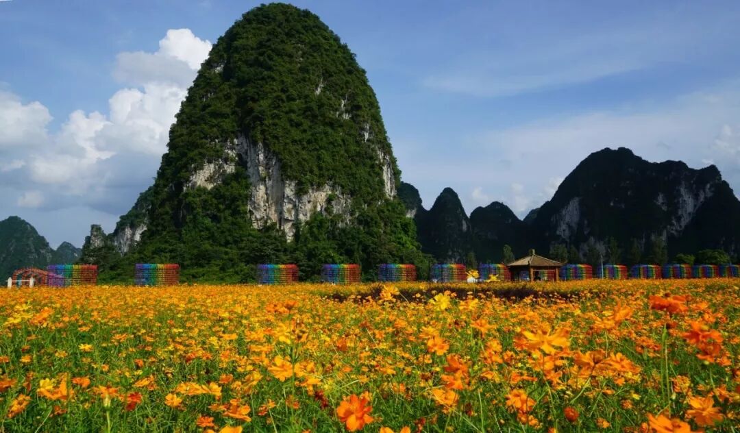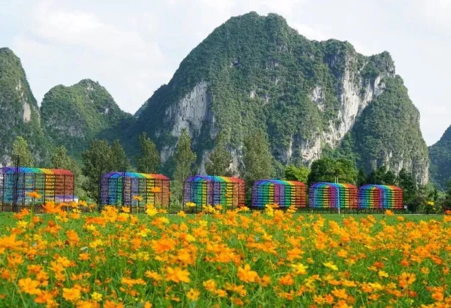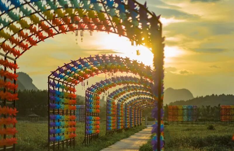 在旧州千亩花海边漫步,感受清凉山风,在七彩风车阵里聆听风铃的清响,潺潺的流水推动水车,望桥边树荫下乘凉,靖西旧州的夏日浪漫且惬意……