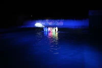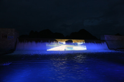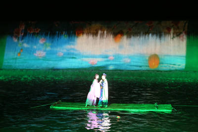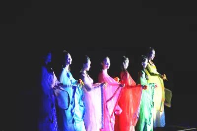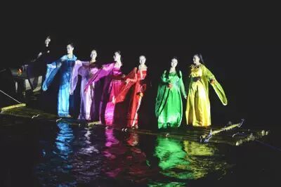 一位绝色天仙已足以让人挪不开眼,更何况华灯初上,出现在夜幕下的龙潭里轻纱披身、姿态袅娜的不是一位而是七位清丽绝尘的天女。在灯光与水幕的映衬下,化身夜色里的一道虹。
